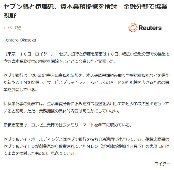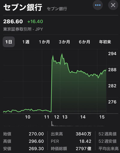 セブン銀行(8410)爆騰がり 今日の午後・・・セブン銀行株が急騰しました。 ほぼ垂直www 低位株ならではなのかも? 理由はこのニュース 以前も「伊藤忠商事」との業務提携の話ってありませんでしたっけ? 確かその時も急騰したような記憶が? ファミマとセブンでどうやって業務提携するのやら???もしかしてATM業務を合併とか?そうなると「セブン・ファミマ」vs「ローソンATM」ってなりますね~ 少し楽しみかも 手持ちの株は平均284で持っているのでこれでプラテンに・・・。何となく俄か上げのような気もしますがw