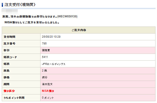 今は日本株も高値で全く食指の湧く銘柄がないのですがもう月末も近いのでNISA口座で唯一マイナスの「JFEホールディングス」を2株だけ追加する事にしました。