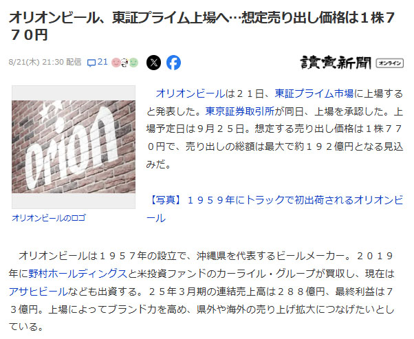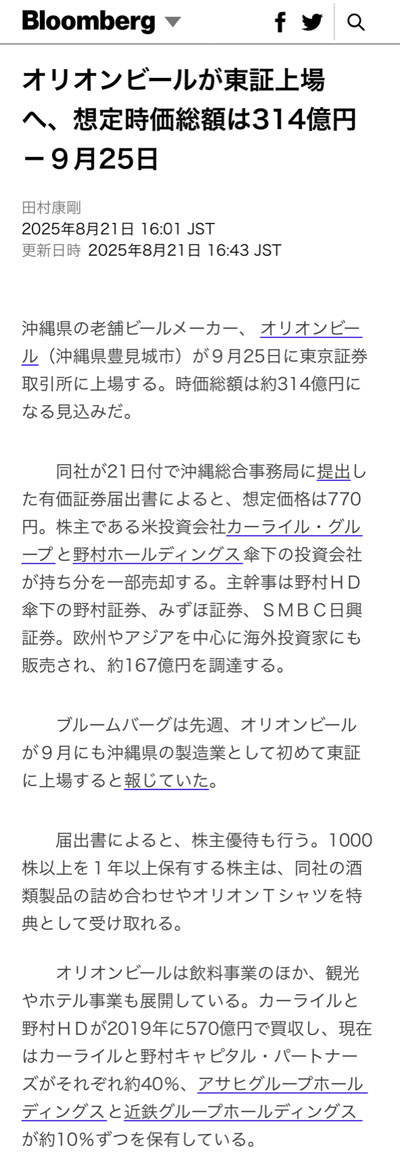 Bloomberg(オリオンビールが東証上場へ、想定時価総額は314億円 2025.8.21)より転載