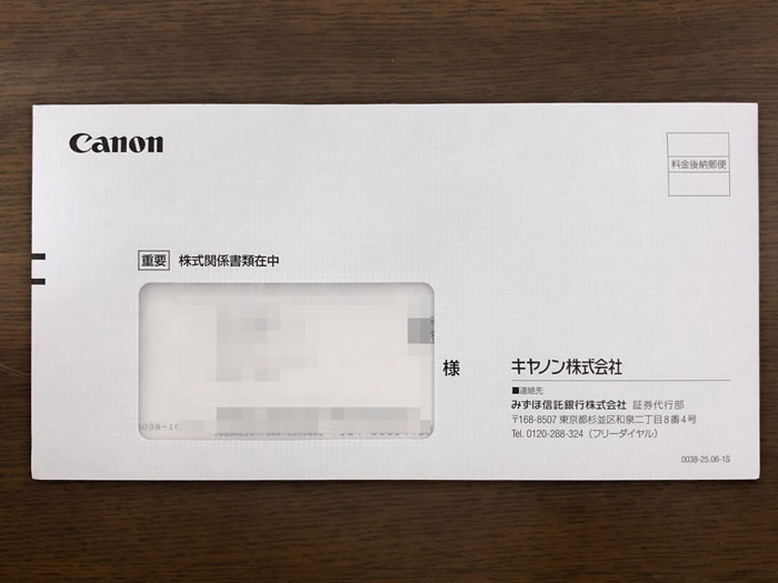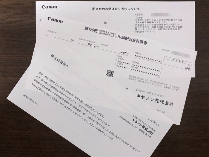キヤノンから株式関係書類が届きました|2024.8.25 配当が入っていたキヤノンから「株式関係書類」も届いていました。 窓付き洋0封筒。墨1色 「配当金のお受け取り方法について」「第125期 中間配当金計算書」「株主の皆様へ」 シンプルに3枚だけ封入されていました。 底辺株主まで送って頂きありがとうございます。