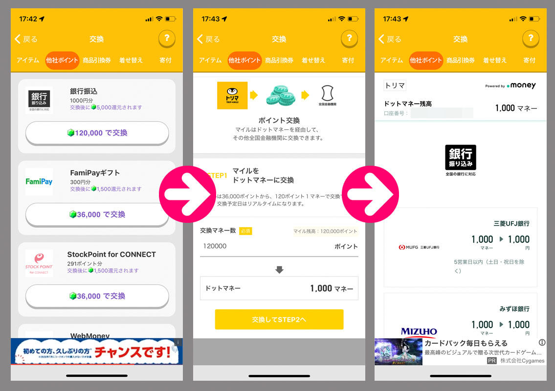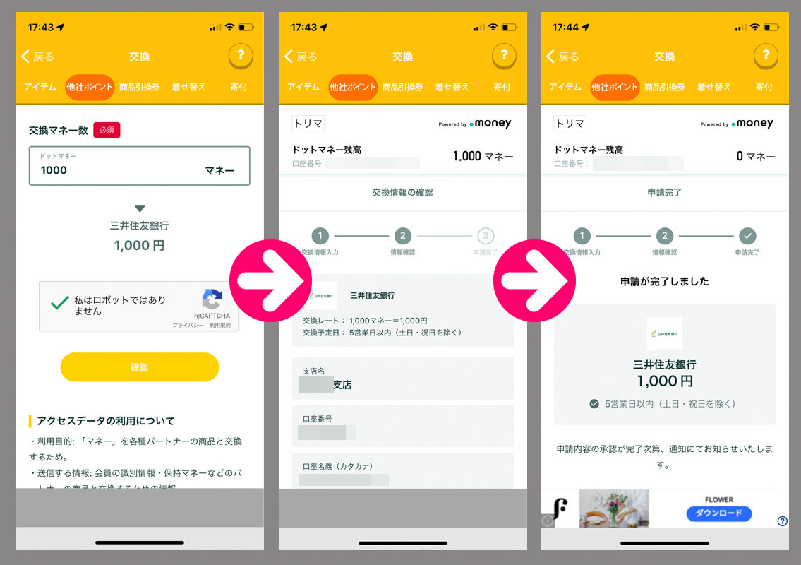 トリマで貯めたマイルをドットマネーに変換からの換金へ|2025.8.29 朝のクラシルリワードに続き「トリマ」のマイルも120,000になったのでこちらも換金手続きをします。 前回が8月1日でしたので29日で達成。今回はいつもより掛かったな~ トリマは三井住友銀行口座に紐づいています。 「トリマ」はクラシルリワードとは違い課金は0なので1ヶ月は仕方ない。。。 むしろこれがあるべき姿。 「トリマ」なのでSBI証券の「iFreeレバレッジFANG+」へそのまま入れる予定です。