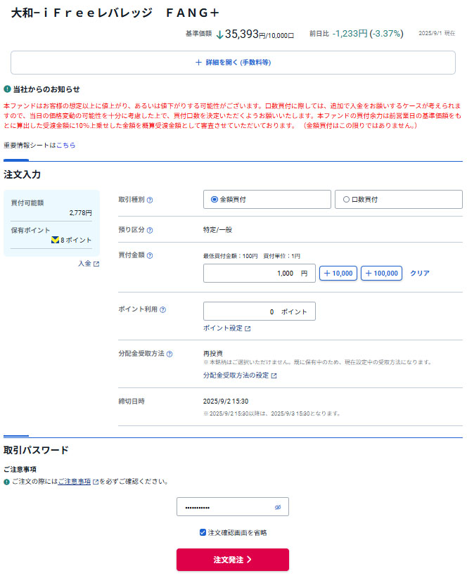こちらも申請していた「トリマ」マイル分のドットマネーが現金化されたので「iFreeレバレッジFANG+」へそのまま1,000円入れます。