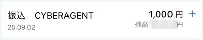 CYBERAGENTから三井住友銀行口座へ1,000円の入金