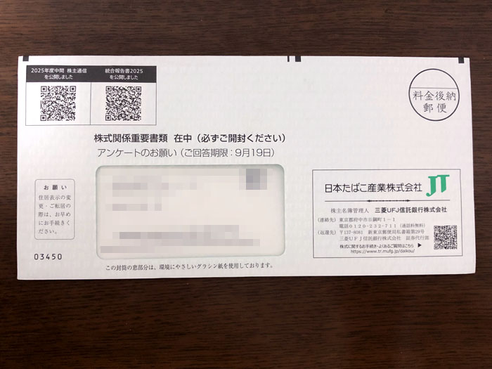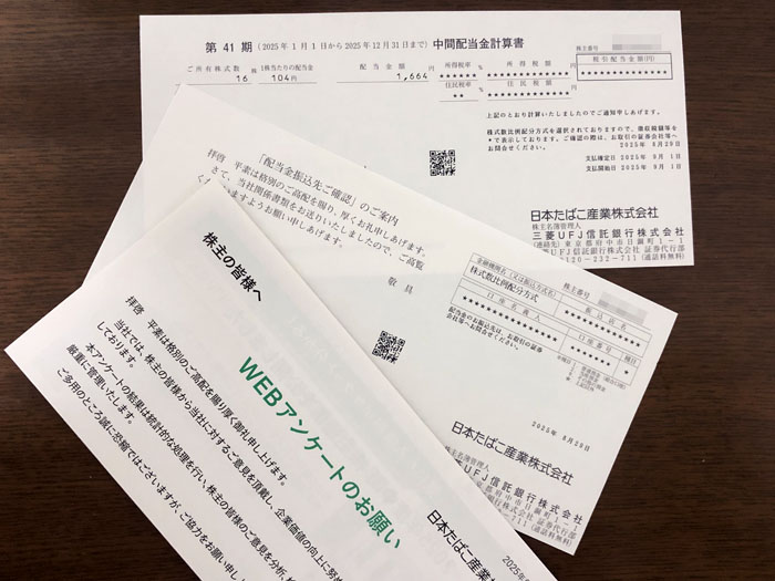 日本たばこ産業(2914)から株式関係重要書類が届きました|2025.9.2 昨日、配当が入った「日本たばこ産業」から株式関係重要書類が届きました。 窓付き洋0封筒2色 中身は「中間配当金計算書」「配当金振込先ご確認 の案内」の2枚に 「株主の皆様へ」のお手紙。 WEBで「株主通信」と「統合報告書2025」を公開したという内容でA4両面ペライチです。 WEBアンケートの案内もありました。