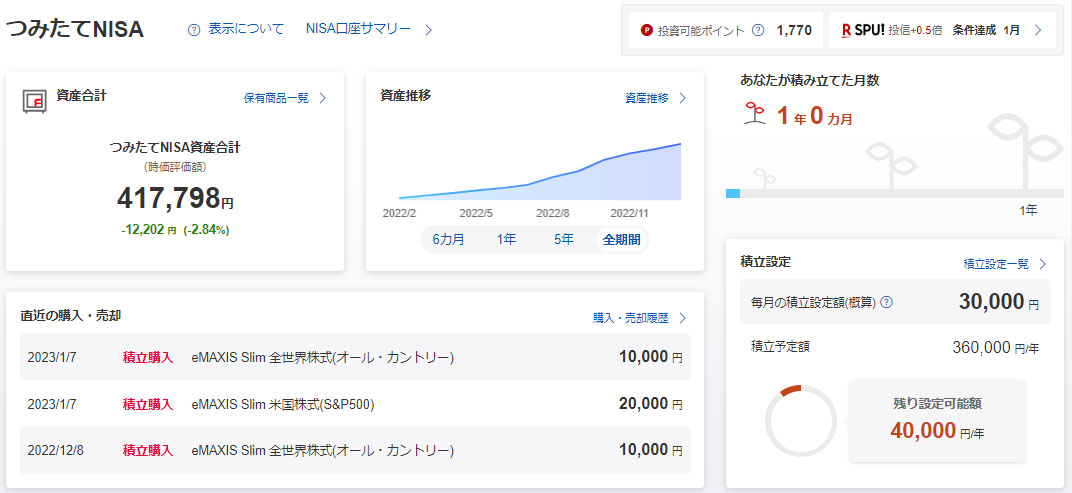 年明けはじめの「つみたてNISA」が約定しましたので資産推移報告です。