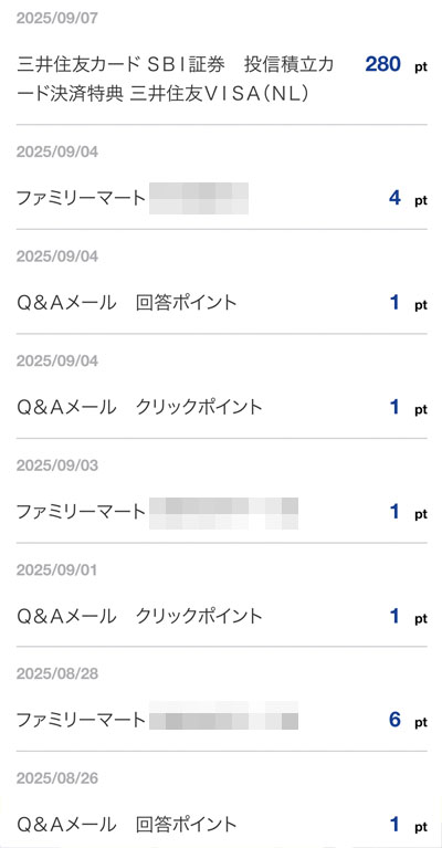 「三井住友カード SBI証券 投信積立カード決済特典 三井住友VISA(NL)」分の280ポイントと「Q&Aメール」、ファミマでの買い物のポイントで計295ポイントです。