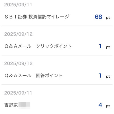 「SBI証券 投資信託マイレージ」68ポイントと「Q&Aメール」2ポイント、吉野家での食事の時、アプリのバーコード提示での4ポイントで計74ポイントです。