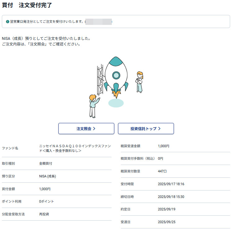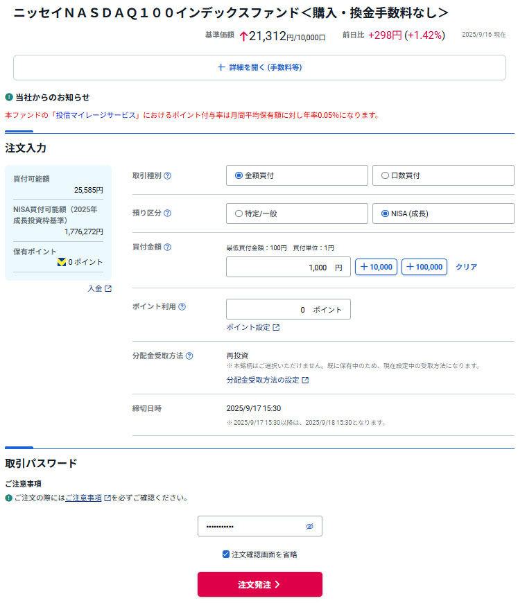 申請していたクラシルリワードコイン分のドットマネーが換金したので「ニッセイNASDAQ100インデックスファンド」へそのまま1,000円分入れます。