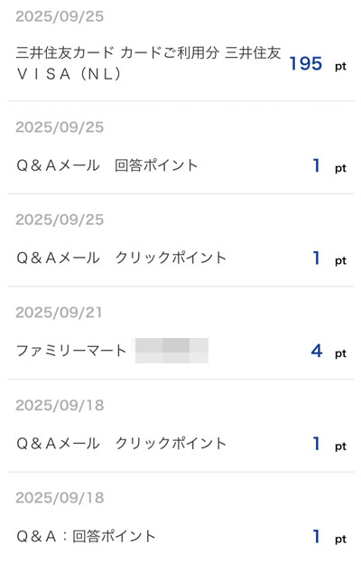「三井住友カード カードご利用分 三井住友VISA(NL)」分の195ポイントとVポイント「Q&Aメール」4ポイント、ファミマでの買い物での4ポイントで計203ポイントとなります。