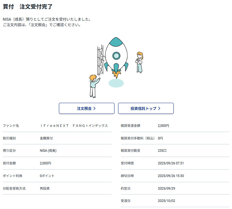 iFree NEXT FANG+インデックスを2,000円分買いました|2025.9.26 まだまだ高値圏ですが若干の調整局面かな?と思い久しぶりに「iFree NEXT FANG+インデックス」を買いました。2,000円分ですがw こちらはNISA口座で運用中です。 ロケット発射! 自分の感覚としてはクリスマスまでは調整で年末はまた騰げる・・・とみています。 ハイテク中心に決算次第だとは思いますが。 約定は週明け月曜日の9月29日(月曜日)です。 正直、少し待てばまだ下がるような気がしていますが少額なので・・・。 これで楽天レバナス売却による資金分は28,000円消費して残りは72,000円です。