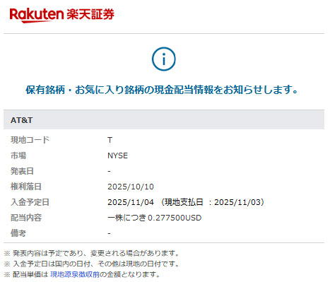 AT&T(T)配当予告 2025.11月分|2025.10.1 米国の高配当銘柄「AT&T」の配当情報メールが楽天証券から届きました。 AT&Tは22株の保有です。 ========(以下、コピペw)======== 配当は$0.2775と前回、前々回、前前々回、前前前々回・・・と同じ $0.2775×22株=$6.105 $6.105×0.9=$5.4945 $5.4945×0.79685=$4.37829・・・で、前回は$4.39でした。 ===========================