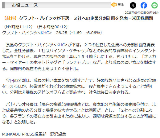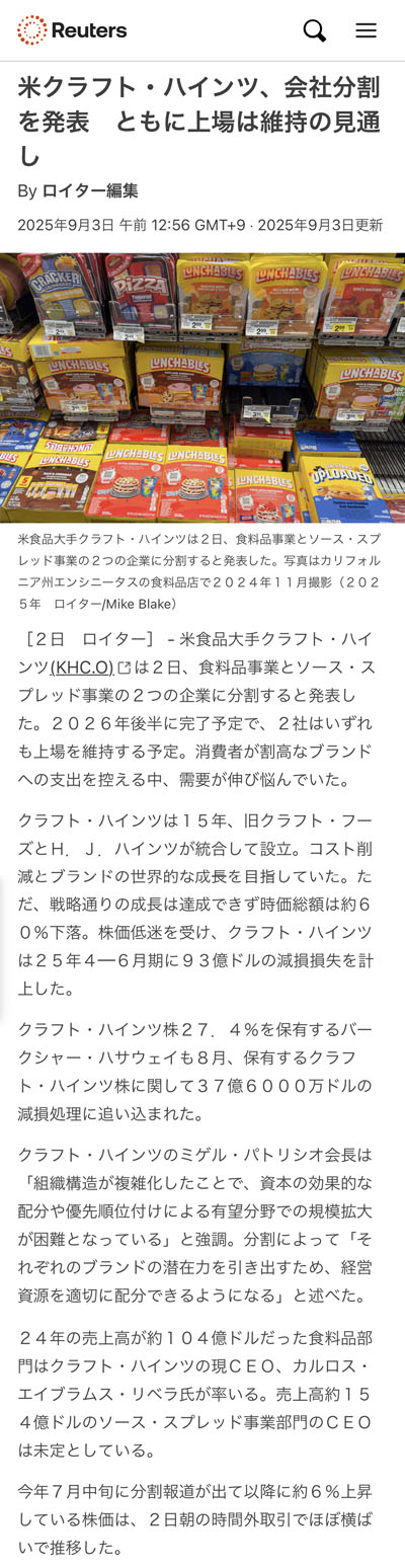 (Reuters 「米クラフト・ハインツ、会社分割を発表 ともに上場は維持の見通しより」2025.9.3より転載)