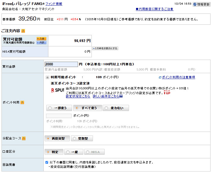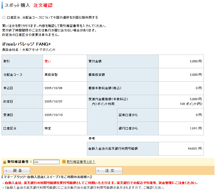 レバレッジの「iFree レバレッジ FANG+」にも2,000円分追加します。