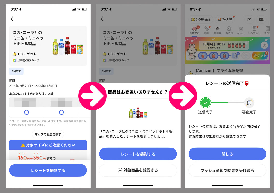クラシルリワードのレシチャレ115 今回のレシチャレはコカ・コーラです。 サイズに制限があり350mlまでの小さなボトル限定でした。 その場で審査完了にならず・・・ でしたが数十分で 完了! スーパーで買ったので78円(税別) これで1,000コインとCMスキップは12時間なので割とコスパは良いかな?と思いまして。