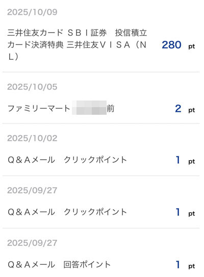 「三井住友カード SBI証券 投信積立カード決済特典 三井住友VISA(NL)」分の280ポイントとファミマでの買い物、Vポイント「Q&Aメール」で合計285ポイントです。