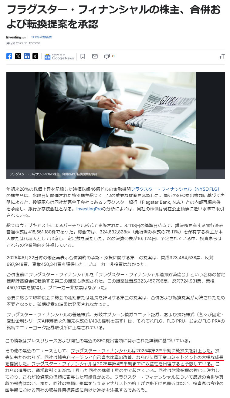 Investing.com(フラグスター・フィナンシャルの株主、合併および転換提案を承認 2025.10.17 より転載)