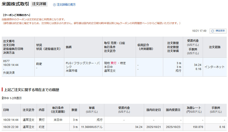 10月21日 昨晩のNYで普通に約定しました。売買日を跨いでいたのかな?