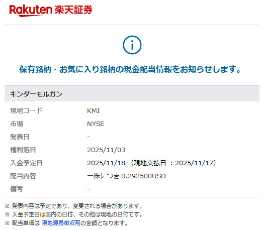 キンダー・モルガン(KMI)配当情報|2025 11月分 楽天証券から米国の高配当銘柄「キンダー・モルガン」の11月配当の情報メールが届きました。 KMIは現在20株の保有です。 ========(以下、コピペw)======== $0.2925×20株=$5.85 $5.85×0.9=$5.265 $5.265×0.8≒$4.212・・・で前回は$4.21でした。 ===========================