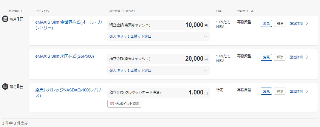ただ、「楽天レバナス」に関しては今まで通りのクレジット決済なので引落日は選べず8日のままとなります。こちらはクレジット決済でのポイント付加が1%なので僅か1000円ですがそのままにしました。