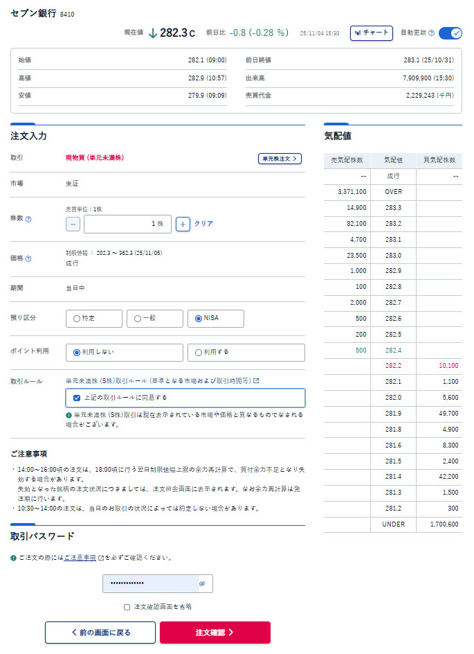 寄り付きの280.2で約定しました。