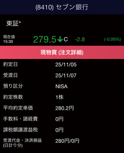 今月も含み損中の「セブン銀行」を単元未満で1株です。