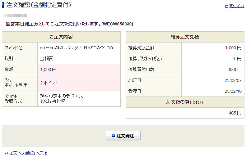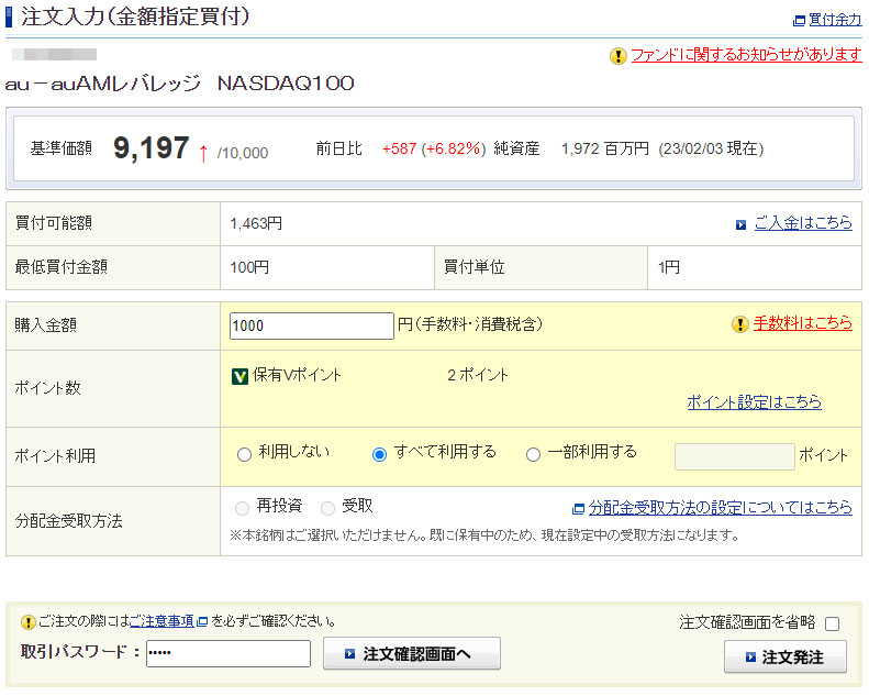 Vポイントが入ったのでauAMレバレッジNASDAQ100を1,000円分追加|2023.2.4 コメントを残す 残り2ポイントは「auAMレバレッジNASDAQ100」へ 「全て利用する」で2ポイントw です。 口座からの持ち出しは998円になります。 「NASDAQ100」はここ数日上がってるので1000円ではたいして元本は増えませんが・・・ これも定期ルーティンで!