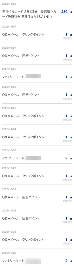 「三井住友カード SBI証券 投信積立カード決済特典 三井住友VISA(NL)」分の280ポイントとVポイント「Q&Aメール」、ファミマでの買い物による付加で計294ポイントです。