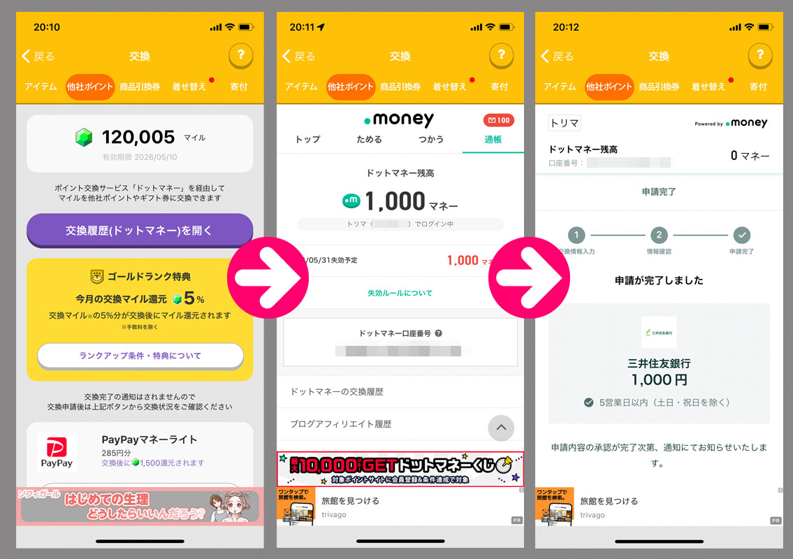 トリマで貯めたマイルをドットマネーに変換からの換金へ|2025.11.11 「トリマ」のマイルが120,000になったので換金の手続きをしました。 前回が10月17日だったのでやはり約1ヵ月。もう少し頑張れば3~4日は短縮できそうですが最近はやや飽き気味でwww 今日が火曜日(夜)なので口座に反映は14日の金曜日かな?