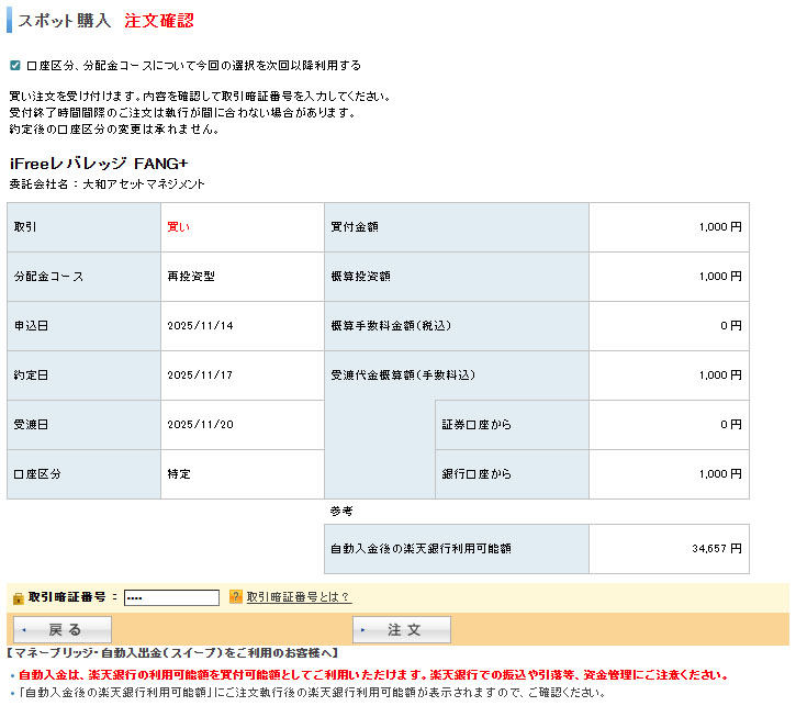 iFree レバレッジ FANG+を1,000円分買い注文|2025.11.13 FANG+の「インデックス」と「レバレッジ」を同日同額の投資でリターンを比較する企画。 なのでw 「iFree レバレッジ FANG+」にも1,000円分入金します。 今回はポイントがないので全額口座からになります。 レバレッジなので楽天証券口座の特定です。 「注文完了」! 約定は「インデックス」と同日の11月17日(月曜日)。 今回も楽天レバナス売却とは別枠になります。