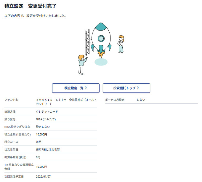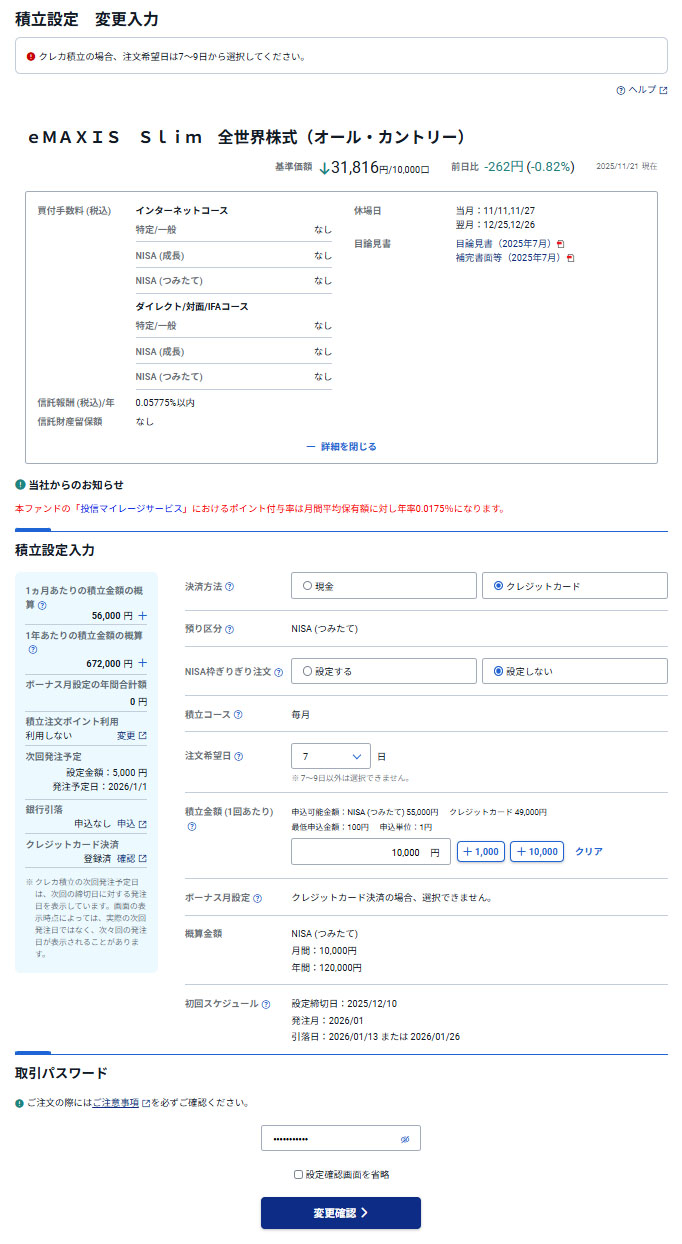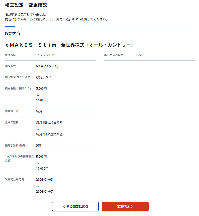 5,000円→10,000円 毎月3日→7日に変更。(微妙に投資タイミングが変わる事になります)