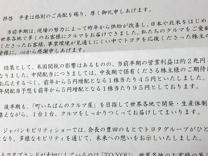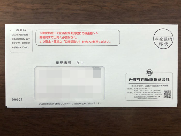 受け取る側は「株」関係と分かるけど外身は他人の目に触れるので敢えて「株」とは判らなくしてるのかも?さすがトヨタ!まぁ郵便配達の局員さんとかは分かるだろうけど・・・w