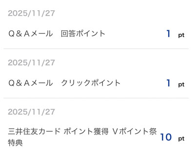 「三井住友カード ポイント獲得 Vポイント祭特典」10ポイントとVポイント「Q&Aメール」の2ポイントで合計12ポイントです。スポット的なものなので少ないですが月末ですし「Vポイント投資」に充てようと思います。