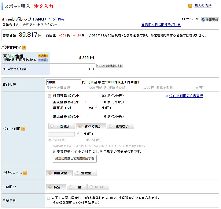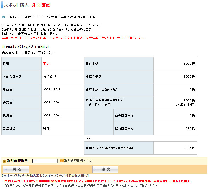 iFree レバレッジ FANG+を1,000円分買い注文|2025.11.27 「インデックス」に1,000円入れたので「レバレッジ」にも1,000円入れます。 こちらは楽天証券の特定口座です。 ポイントが23ポイント貯まっていたので全て利用します。 よって現金は977円。 約定は12月1日(月曜日)です。 「注文完了」 かわいく1,000円のみw 今回も楽天レバナス売却とは別枠になります。