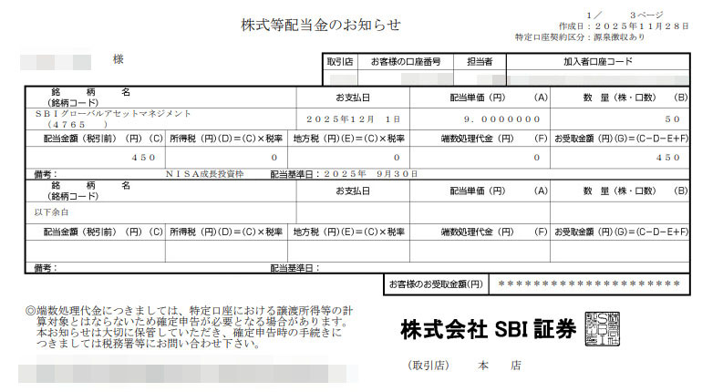 「SBIグローバルアセットマネジメント」からは初めての配当です。