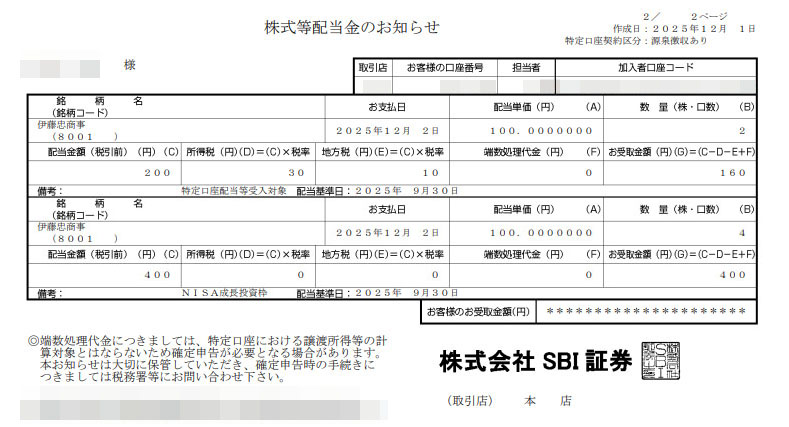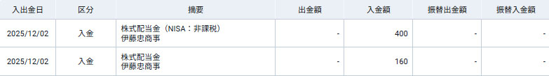 現在、追加購入は見送っている「伊藤忠商事」から配当が入りました。