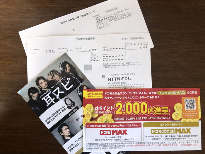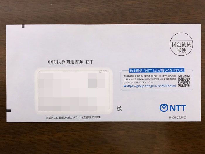 NTT(9432)から中間決算関連書類が届きました|2025.12.1 社名が変わって初めての配当が出た「NTT」から「中間決算会計書類」が届きました。 ロゴも微妙に変わっています。 窓付き洋0封筒 2色 中身は「配当金のお受け取り方法について」「中間配当金計算書」 ・・・と販促のフライヤーです。 読み物は無し。。。