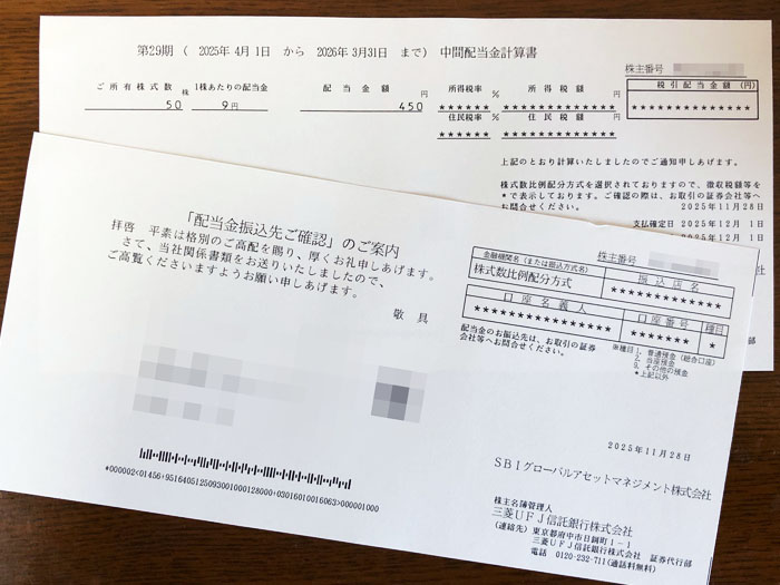 SBIグローバルアセットマネジメント(4765)から株式関係重要書類」が届きました SBIグローバルアセットマネジメントから「株式関係重要書類」が届きました。 窓付き洋0封筒 特イチ 中身はシンプルに「配当金振込先ご確認 のご案内」「第29期 中間配当金計算書」の2枚のみ まだ50株で単元なかったけど単元あってもこんな感じなのかも?SBIだしwww