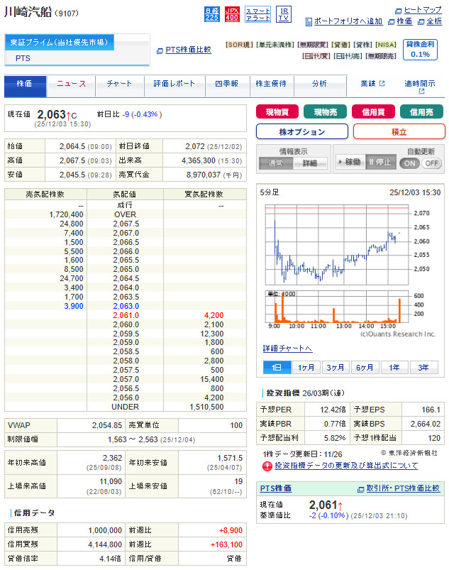 株価が下がり配当利回り5.82%と驚異的になったw 船体に “K” LINE でおなじみの川崎汽船を5株買うことにしました。