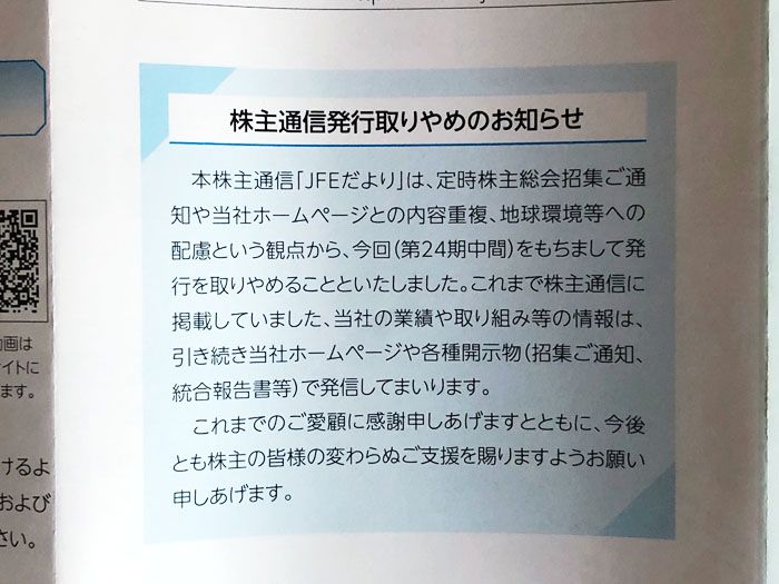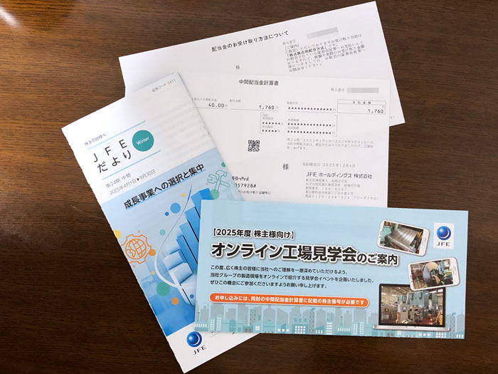 JFEホールディングス(5411)から「JFEだより」が届きました|2025.125 日本の高配当銘柄「JFEホールディングス」から「JFEだより」が届きました。 窓付き洋0封筒 3色 内容は「配当金のお受け取り方法について」「中間配当金計算書」「オンライン工場見学会のご案内」と「JFEだより」です。 この「JFEだより」は今回で最後だそうです。。。 楽しみだったので残念。WEBで発信っても多分見ないんだよねw