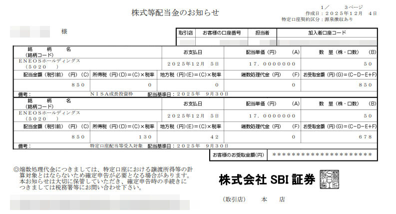 「高配当株15(+1)銘柄」のENEOSホールディングスから中間配当が入りました。