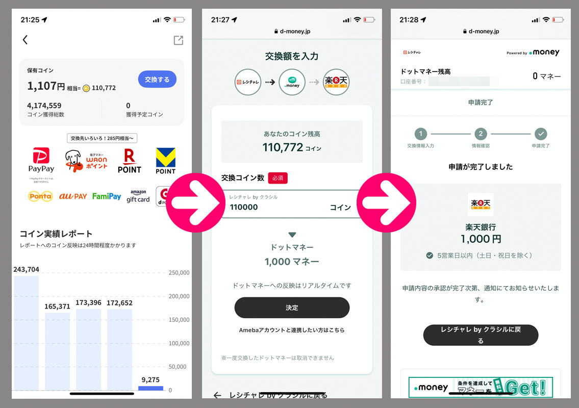 レシチャレのポイントが貯まったのでドットマネーに変換→換金へ|2025.12.4 レシチャレもコインが110,000になったので換金手続きへ。 最後はおみくじで帳尻合わせ。「トリマ」の換金手続きをしたのでついでに。 レシチャレは大幅にルールが変わりました。いろいろありますが「CMスキップ」の条件が変わってしまいこれが一番痛い。動画広告はウザいのが多くなった(これはトリマも同じ)。配信会社は同じだろうから同じ流れ。見るに堪えない動画がホントにウザイ! 換金はこちらも火曜日かな?楽天銀行口座です。