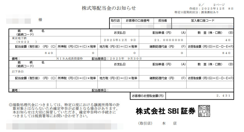このところ株価低迷中の「東京地下鉄」。。。から配当が入りました。