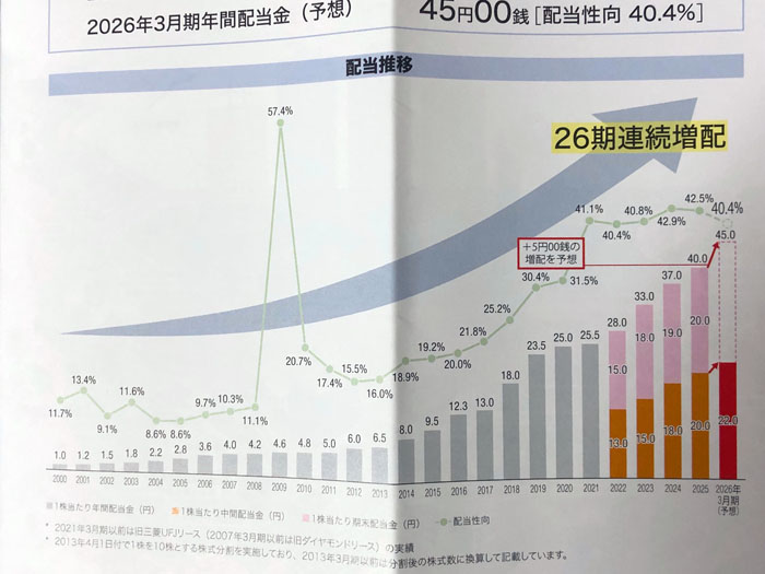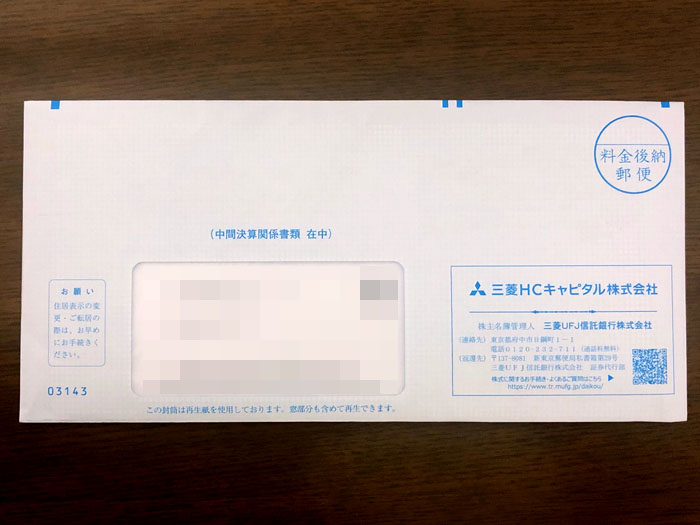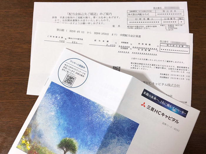 三菱HCキャピタル(8593)から中間決算関係書類が届きました|2025.12.8 三菱HCキャピタルから中間決算関係書類が届きました。 窓付き洋0封筒 特イチ 中身は「配当金振込先ご確認のご案内」「第55期 中間配当金計算書」と「株主通信」でした。 三菱商事がローソンを子会社化したためかグループ間でシナジーが生まれてるようですね~ 連続増配でおなじみの銘柄 今回は上げ幅が5円と大き目・・・来年もお願いします。 三菱HCキャピタルは地味な銘柄ですが個人株主には人気。株式の多くを三菱商事と三菱UFJフィナンシャルグループ、三菱UFJ銀行が保有してるので安心感もあります。こちらもあと100株ぐらいは欲しいのですが・・・。