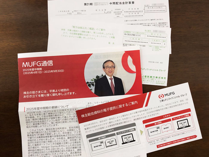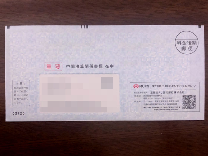 三菱UFJフィナンシャルグループから中間決算関係書類が届きました