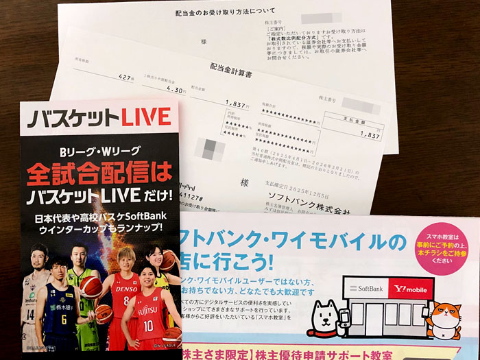 ソフトバンク(9434)から株式関係書類が届きました|2025.12.8 ソフトバンクから株式関係書類が届きました。 窓付き洋0封筒 特+スミ 中身は「配当金のお受け取り方法について」「配当金計算書」とチラシが2枚 バスケットLIVEが限定で見れる優待と同じく優待のペイペイポイントの受け取り方の案内です。 受け取り方はかなり詳しく書いてあります(また読んでいませんがw)。 決算資料的なものはありませんでした。