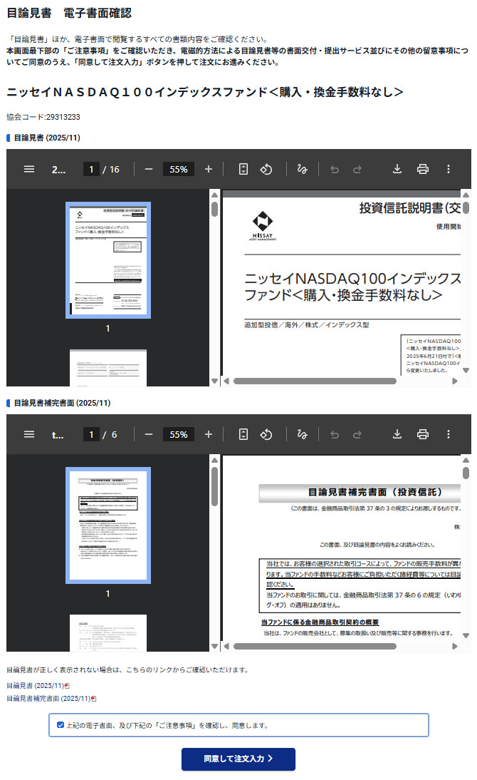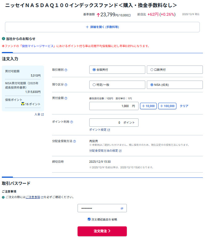 歩いて稼いだ資金を「ニッセイNASDAQ100インデックスファンド」へ|2025.12.9 換金手続きをしていた「レシチャレ」コイン分のドットマネーが現金化され入金されました。 楽天銀行口座に「CYBERAGENT」から1,000円の入金。 レシチャレなので「ニッセイNASDAQ100インデックスファンド」に入れます。 ・・・と、その前に目論見書の確認がありました。 同意 「ニッセイNASDAQ100インデックスファンド」はNISA口座です。 入金の1,000円をそのまま投入! ロケット発射! 約定は12月11日(木曜日)です。
