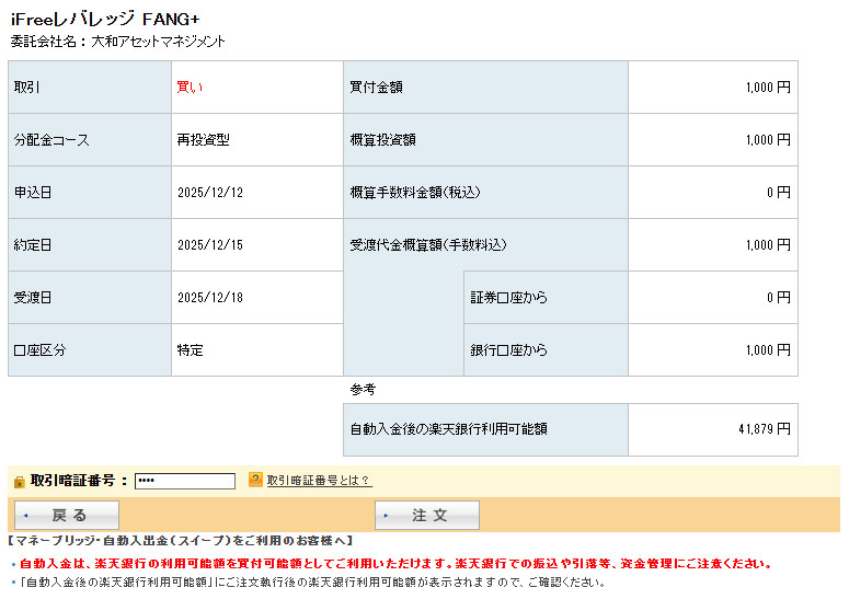 iFree レバレッジ FANG+を1,000円分買い注文|2025.12.11 楽天証券で運用中の「iFree レバレッジ FANG+」にも1,000分追加します。 「FANG+」企画は「インデックス」と「レバレッジ」に同日同額投資をしてどちらが優れているかを実験しています。 楽天証券口座。ポイントは172ポイントあったのに使わずに発注してしまった。。。まぁ次回に回せばいいのだけれど・・・。ですので全額口座からの現金です。 約定は「インデックス」と同じ12月15日。 注文完了! 今回も楽天レバナス売却とは別枠になります。