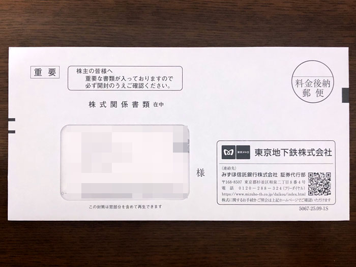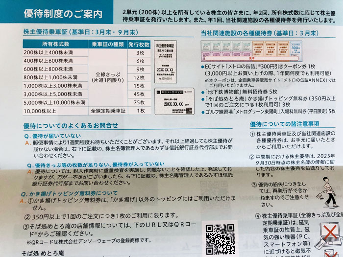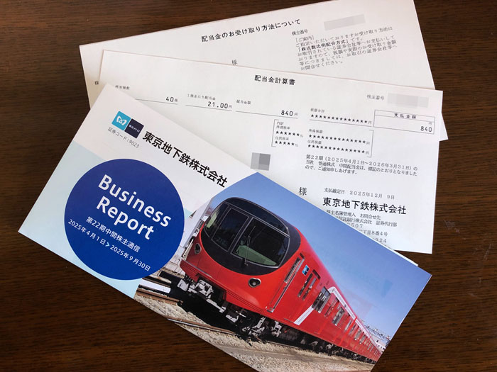 東京地下鉄(9023)から株式関係書類か届きました|2025.12.11 東京地下鉄から株式関係書類か届きました。 窓付き洋0封筒 墨イチ 中身は「配当金計算書」「配当金のお受け取り方法について」「Busuness Report」です。 「Busuness Report」って株主通信の事みたい 業績ハイライト 公共機関だけに爆益は無いがここ3年は増益です。増配もしてますね~まだ単元持ってないのでイマイチぴんとこない。 東京地下鉄は200株から優待が発生 全線定期乗車証は10,000株以上・・・1,600万!無縁ですわw 私の場合は「かき揚げトッピング」がせいぜいwww 年一回、貰った切符でかき揚げ天そば食べに行くことぐらいかな???
