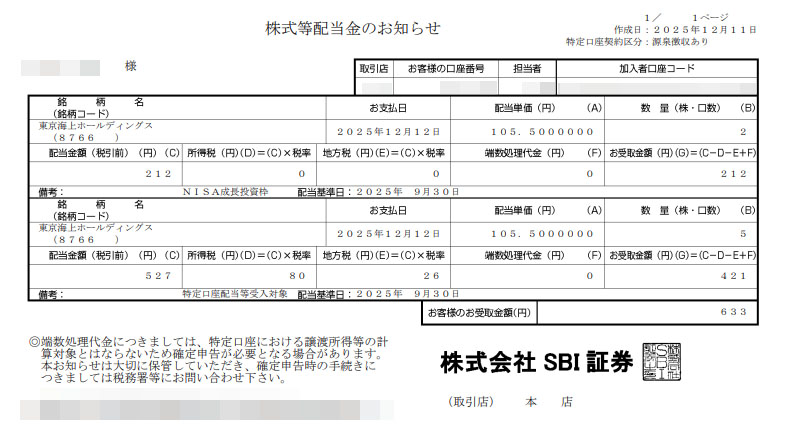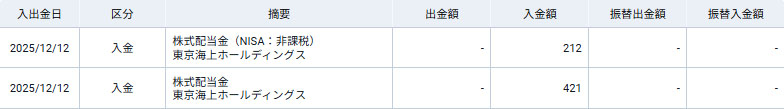 これを書いている時点では未来の事ですが・・・。 東京海上ホールディングスから明日12月12日に配当が入るようです。