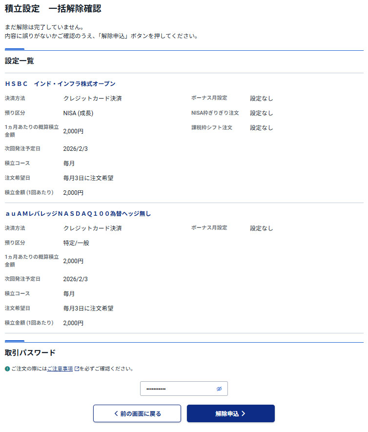 現在、積み立て中の「HSBCインド・インフラ株式オープン」と「au-AMレバナス為替ヘッジ無し」の積み立てを解除しました。